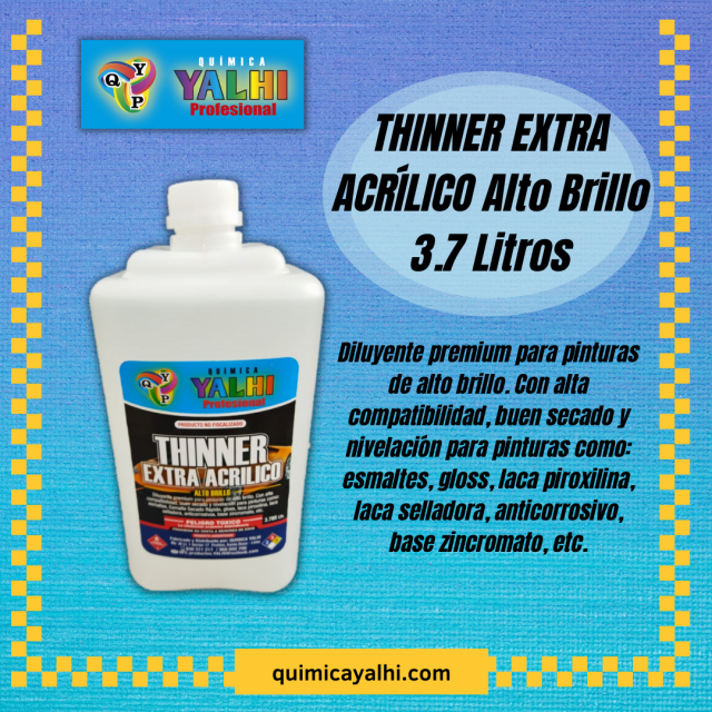 Diluyente premium para pinturas de alto brillo. Con alta compatibilidad, buen secado y nivelación para pinturas como: esmaltes, gloss, laca piroxilina, laca selladora, anticorrosivo, base zincromato, etc.